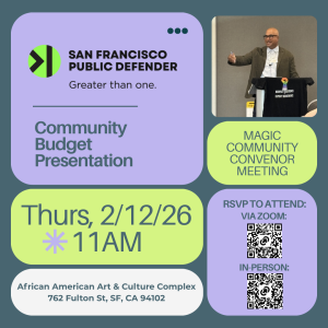 Legal Notice: The content of this site does not constitute legal advice. The views expressed on this site belong to the original authors alone and do not necessarily reflect the views of the San Francisco Public Defender's Office, its members or affiliates. All content is provided "as is" for informational purposes only, and San Francisco Public Defender's Office makes no representations as to the accuracy, completeness, currentness or suitability of the information on this site. San Francisco Public Defender's Office is not responsible for and does not endorse any materials, information, viewpoints, goods or services available through third party sites linked from this site. All images, unless otherwise noted, are property of the San Francisco Public Defender's Office and may not be used without our expressed permission.
